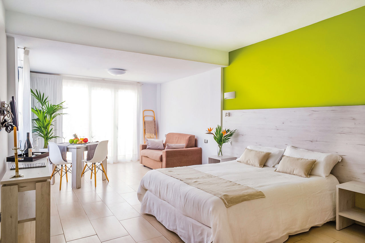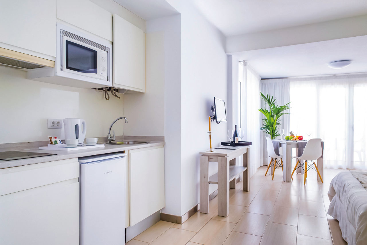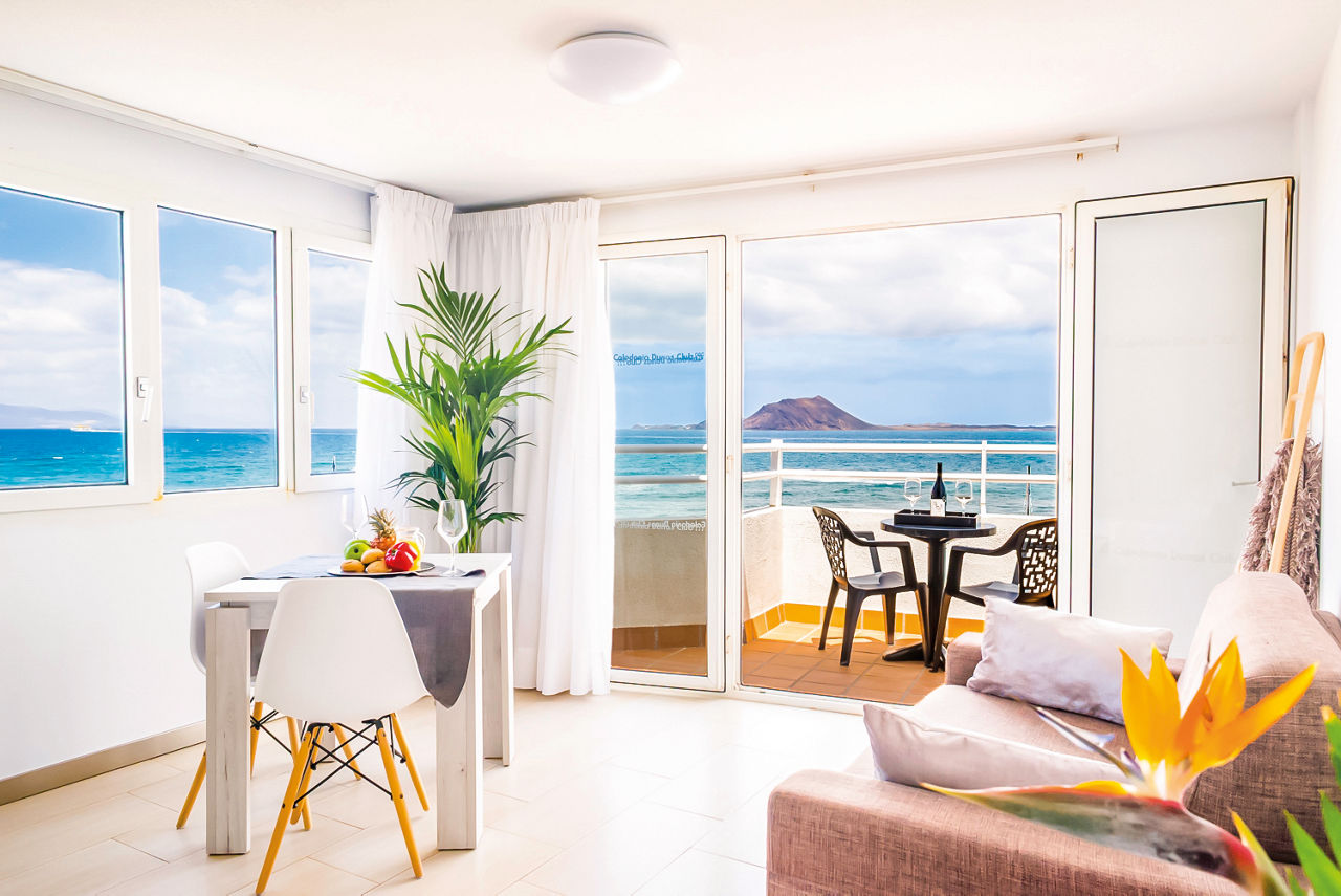 On the seafront, the Dunas Club Apartments is just steps from the beach and a few minutes walk away from Corralejo town, the convenient location of these apartments make them the perfect base for a relaxing holiday in Fuerteventura. Relax by the pool soaking up the sunshine, explore the Corralejo Harbour right on your doorstep or enjoy an excellent meal in the hotel restaurant over looking the sea towards Lobos Island. Ideal for couples and friends, you will enjoy these simple but well-equipped apartments and studios in the great location by the sea and close to all of the excitement of Corralejo town centre with its shops, bars and restaurants.Studios sleep up to 3 adults and have bathroom with shower over bath, hairdryer, satellite TV, kitchen with double cooking rings, fridge, kettle, microwave, toaster and coffee making facilities and, a balcony or terrace. Studios with Pool View, Studios with Side Sea View, Studios with Sea View and One Bedroom apartments with Pool View are also available.